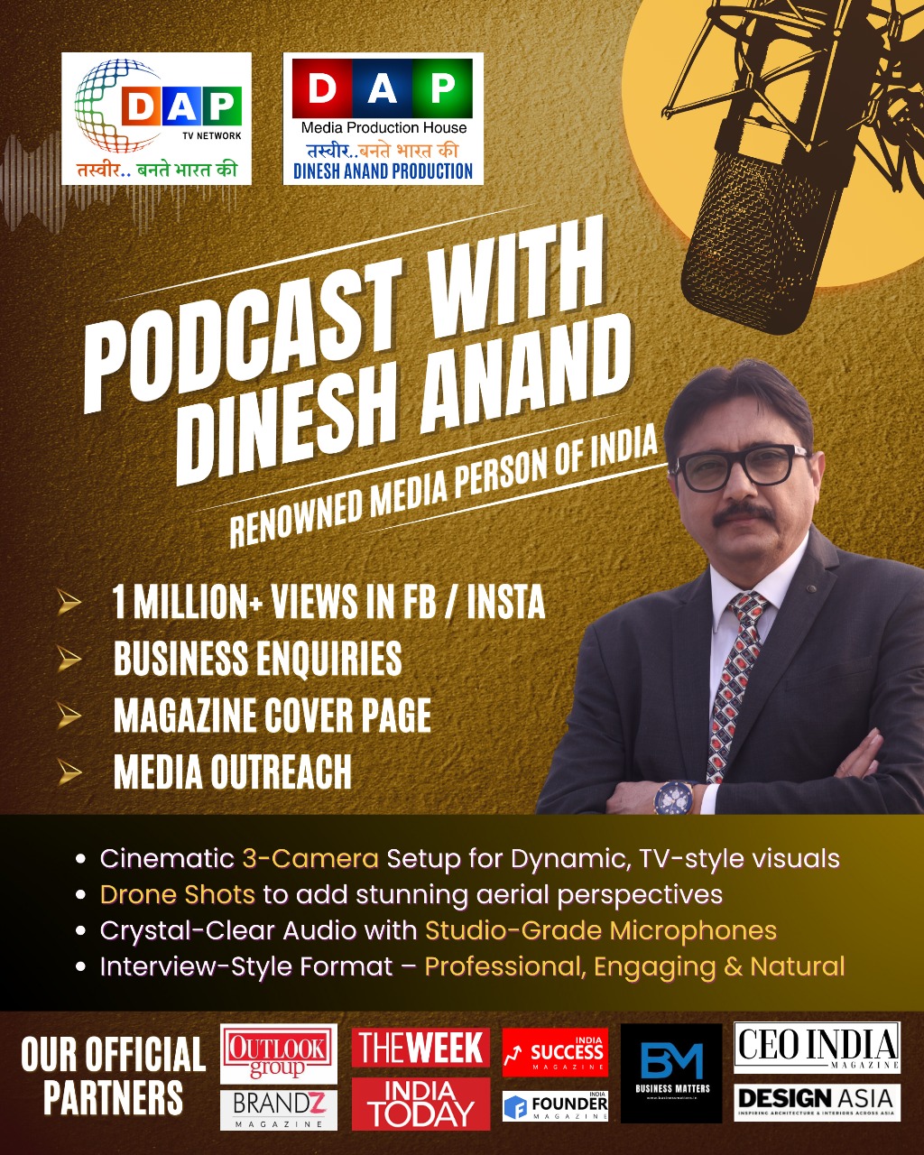 Dinesh Anand Production (DAP) India’s one of the largest PR firm, started its journey from Pataliputra, known as modern-day Patna, an ancient city that sprawls along the south bank of the Ganges River in Bihar, northeast India. Today, we have dedicated offices in New Delhi, Varanasi, Mumbai, Kolkata, and many other places and a team across India. DAP, today is among India’s leading film and media production houses. DAP specializes in documentaries, short films, events, digital website publications, podcasts, and digital video studio interviews, collaborating with top media brands like Outlook, The Week, India Today, Aaj Tak, ABP News, and many more.